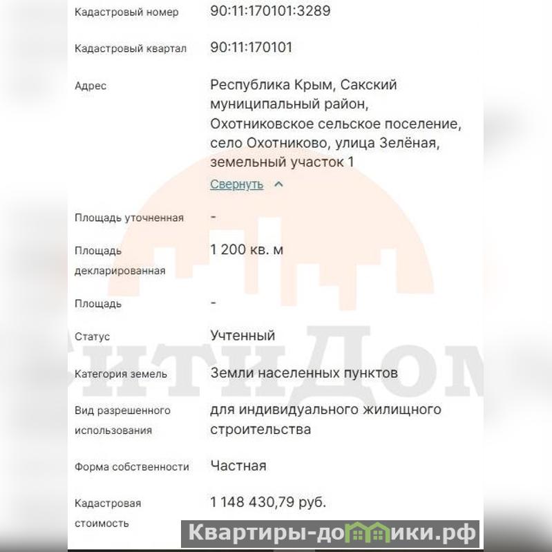 Продается участок 12 соток в п. Охотниково (Крым) – идеальное место для жизни и отдыха! ИЖС – можно строить дом сразу! Коммуникации: электричество на участке, вода рядом (водонапорная башня в 2 метрах), газовая магистраль недалеко. Инфраструктура под рукой: Магазины, аптека, больница Школа и детский сад – прямо через дорогу! Церковь, мечеть, пункты выдачи заказов, автозаправка Озеро и база отдыха "Петькина речка" с рыбалкой и зоопарком – в шаговой доступности Отличная транспортная доступность: Новая трасса "Таврида" всего в 1 км (Симферополь – Евпатория – Мирный) До Евпатории – 23 км, до Саки – 12 км Участок готов к использованию: Полностью огорожен ракушечником Есть хозпостройки и гараж со смотровой ямой Отличное место для постоянного проживания или дачи с перспективой! Звоните, чтобы узнать детали и договориться о просмотре! При звонке сообщите, пожалуйста, номер объекта 2162, чтобы мы могли предоставить вам интересующую информацию оперативно.