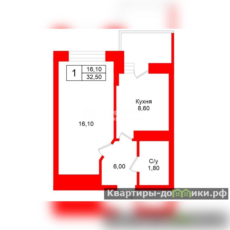 Общая площадь 32,5 кв.м. (без учета лоджии). Выход на лоджию из кухни. Жилая комната 16,1 кв.м. Кухня 8,6 кв.м. Окна выходят на Юго-Восток, солнце светит в окна с утра до 16:00. Вид из окон во двор, на тихую сторону.