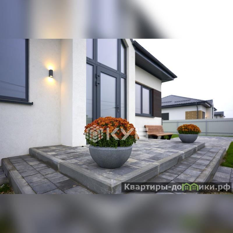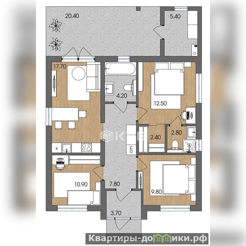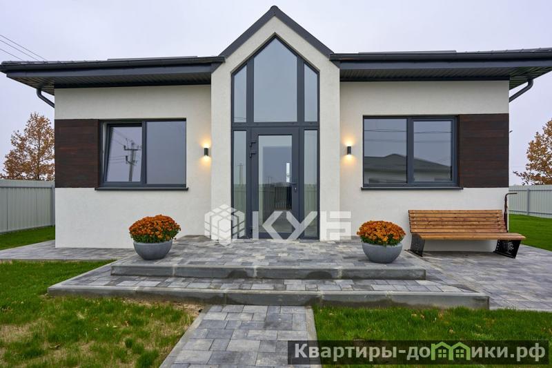 - Дом имеет просторную кухню-гостиную 17.7 м2, мастер-спальню (хозяйская) с гардеробной и санузлом, две обычных спальни, ванную комнату, большую террасу 20.4 м2.