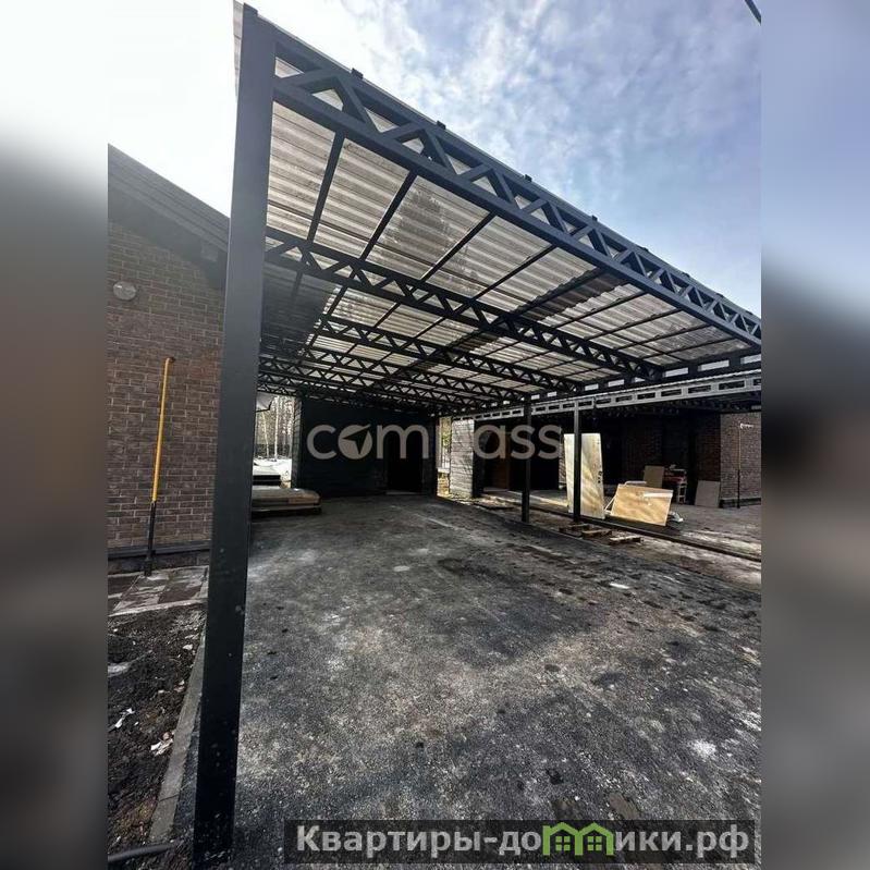 Навес на два авто, хозблок, терраса с маркизой, откатные ворота, забор, газон перед домом, фасадная подсветка.