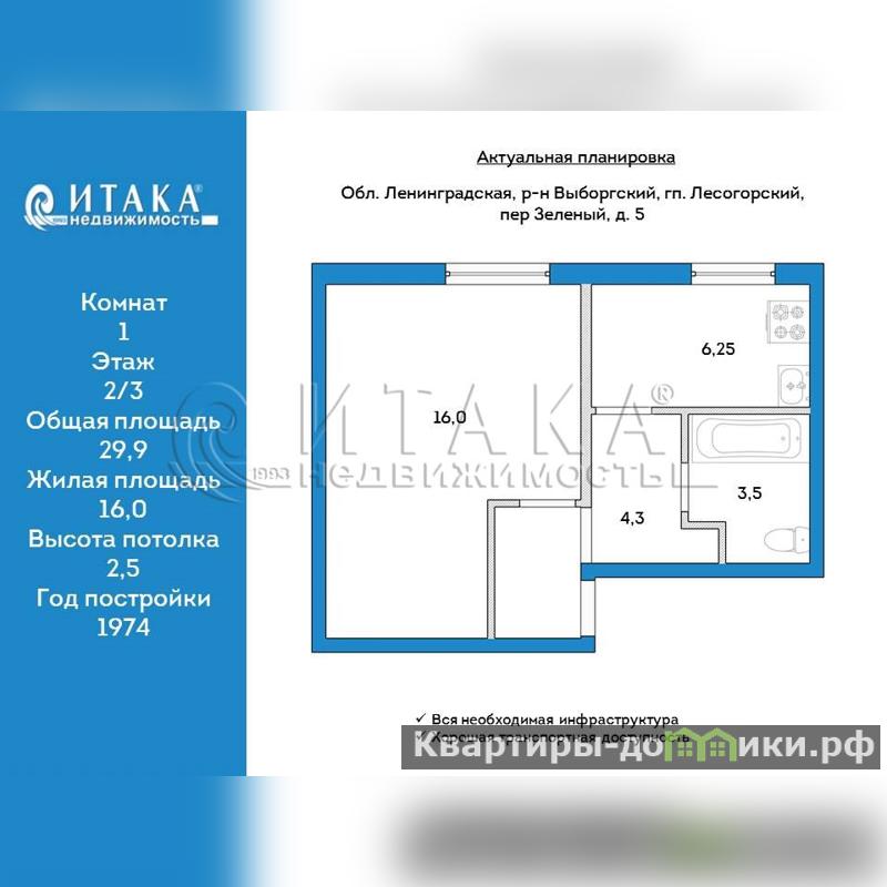 Кухня – 6,25м2, комната – 16м2; коридор – 4,3м2.