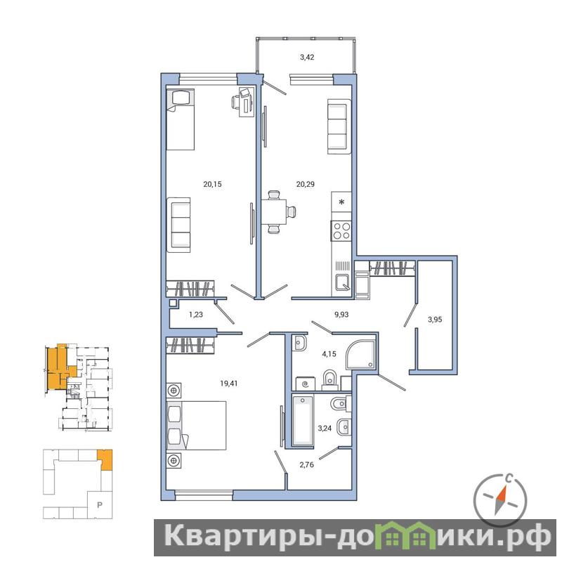 Жилая площадь 39.56 м2, кухня 20.29 м2, чистовая отделка. Раздельных санузлов - 2, балконов - 1, окна выходят на улицу.