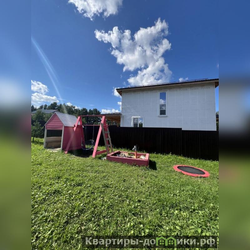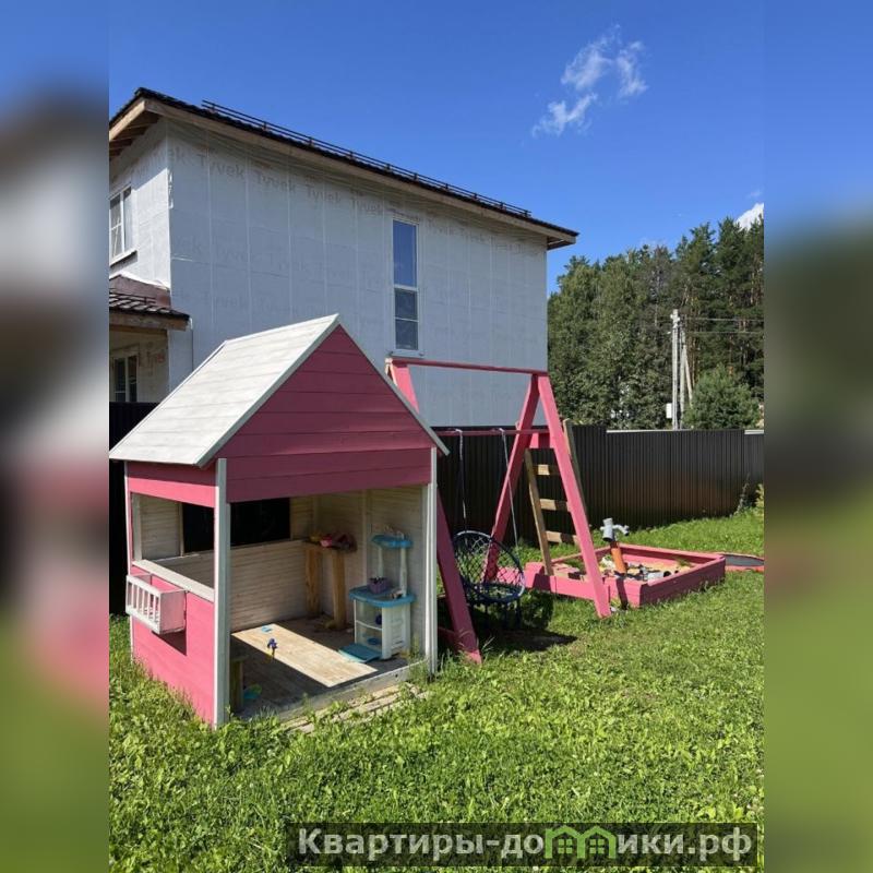 - На участке стоит детская игровая зона: детский розовый домик, песочница, батут, качели.