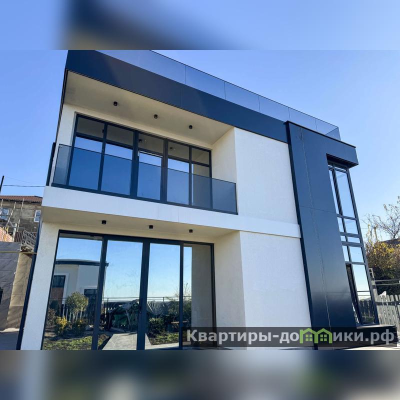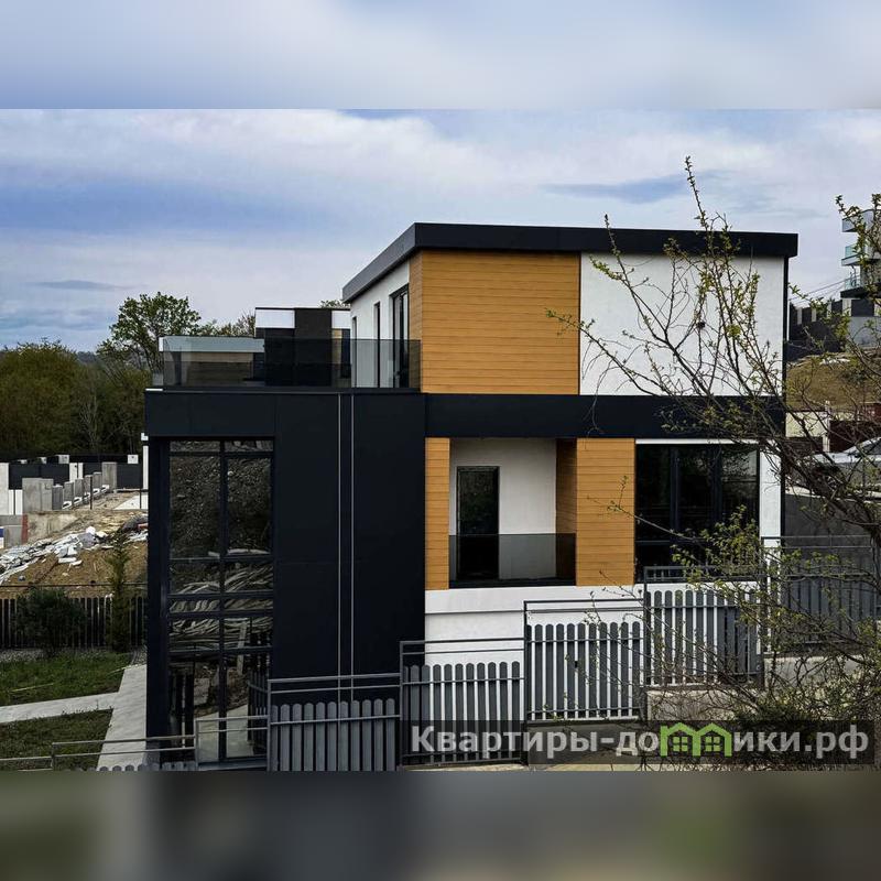 Площадь дома 280 кв.м. Дом построен в соответсвии с уведомлением на строительство. Фундамент свайный. Фасад комбинированный - алюкобонд, рейка, декоративная штукатурка. Остекление - алюминиевый панорамный профиль.
