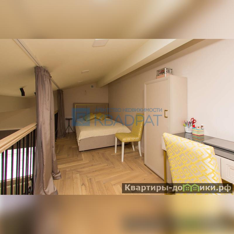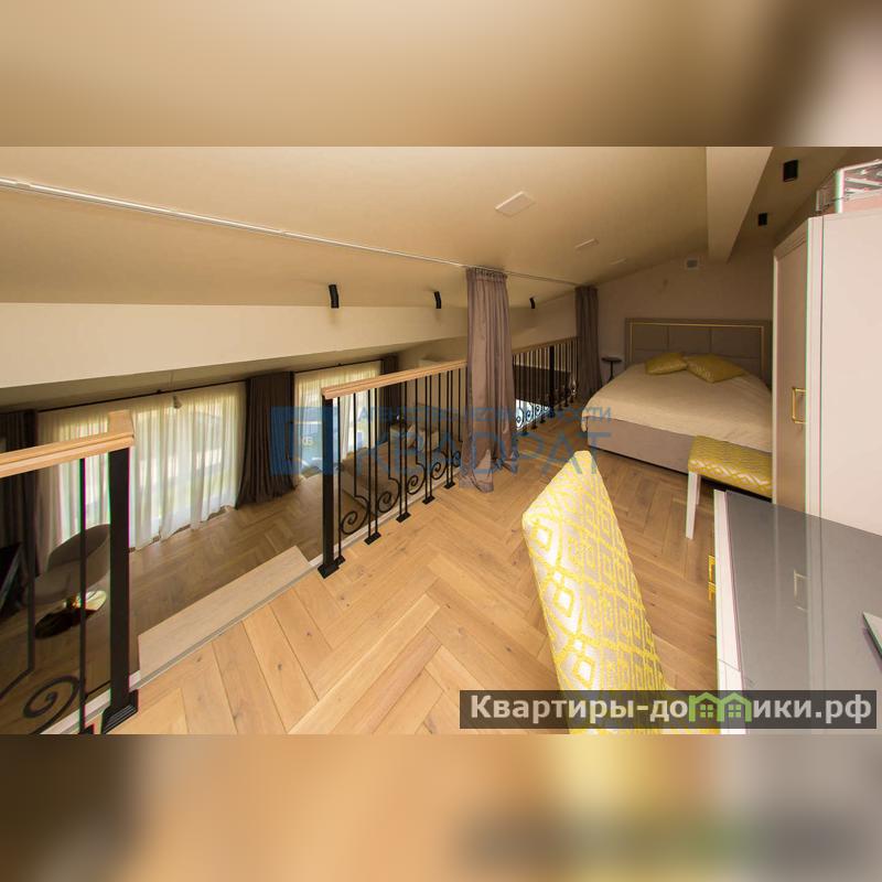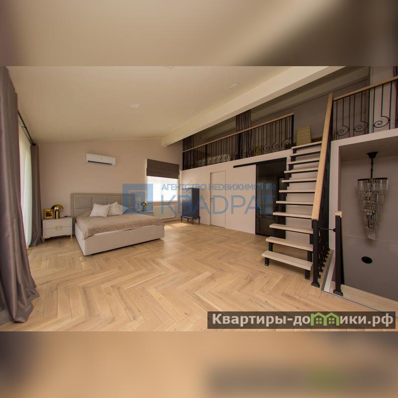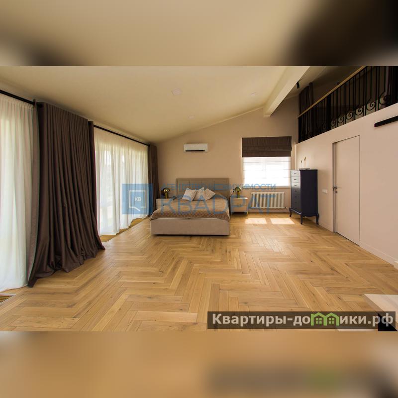 На второй этаж ведет дубовая лестница, там расположена спальня с панорамными окнами, сан/узел с ванной и гардеробная. Высокие потолки позволили сделать мансардный этаж. Остается все корпусная мебель и кровать с подъемным механизмом.