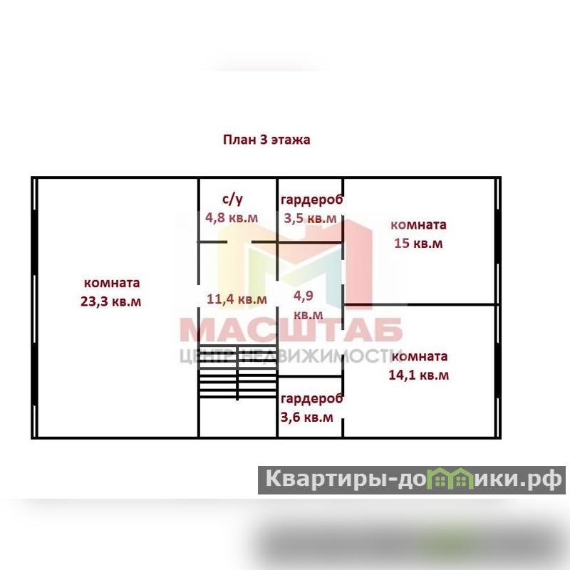 3 этаж - три спальни 23,3 + 15 + 14,1 кв.м, две гардеробные, сан. узел.