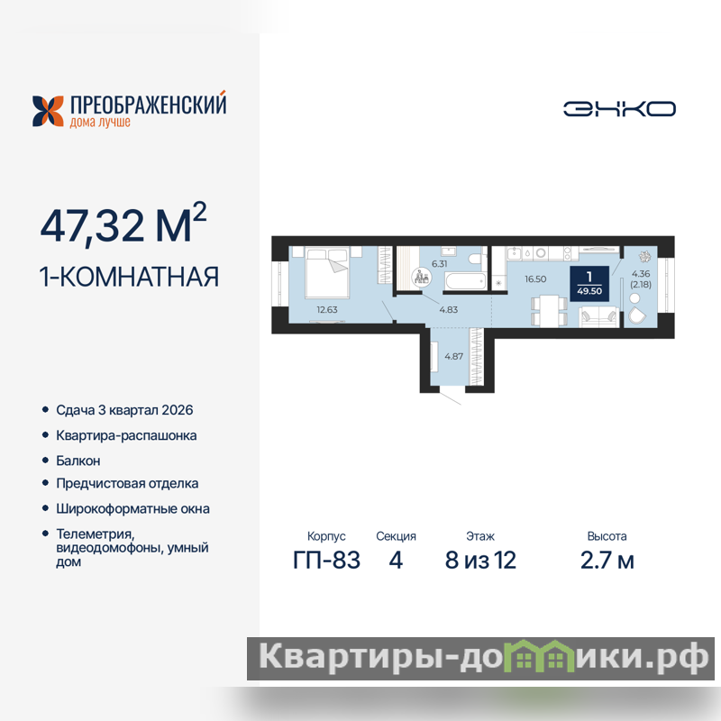 Продается однокомнатная квартира с предчистовой отделкой в ЖК "Преображенский" на 8 этаже. Общая площадь: 47.32 кв.м., жилая: 12.63 кв.м., площадь просторной кухни-столовой: 16.5 кв.м. Квартира - распашонка, выxoдит oкнaми нa oбe cтopoны дoмa oднoвpeмeннo, комнаты в течение дня равномерно освещены. В квартире один балкон, один совмещенный санузел. Высота потолков 2.7 м. Дом монолитный, многоподъездный, переменной этажности, от 8 до 12 этажей. Квартира находится в 4-й секции высотой 12 этажей в корпусе ГП-83. На этаже 6 квартир. В подъезде 1 пассажирский и 1 грузовой лифт. Начало строительства - 4 квартал 2023 года. Окончание строительства - 3 квартал 2026 года. Оформление сделки по договору долевого участия. Квартал будет расположен в микрорайоне Славянский на пересечении улиц Мира и 70-летия Октября. Престижный район, собственный парк, вся необходимая для жизни, учёбы и работы инфраструктура — новая школа с бассейном и кванториумом, новый детский сад, поликлиника, спорткомплекс, магазины и др. Чтобы в квартирах было как можно больше свободного пространства, мы предусмотрели индивидуальные кладовые на цокольном этаже. Оставляйте коляски и сезонный спортинвентарь после прогулок здесь — удобно для вас и чисто для квартиры. В подземный паркинг можно спуститься на лифте прямо с квартирной площадки. (AQID02484241)