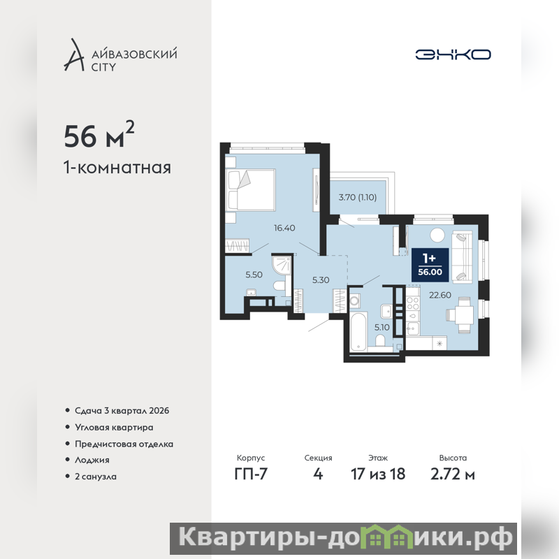 Продается 1-комн. квартира с предчистовой отделкой в ЖК "Айвазовский City" на 17 этаже. Общая площадь: 56 кв.м., жилая: 16.4 кв.м., площадь просторной кухни-столовой: 22.6 кв.м. Угловая квартира, идеально подойдет любителям тишины и панорамных видов. В квартире одна лоджия, два совмещенных санузла. Высота потолков 2.72 м.