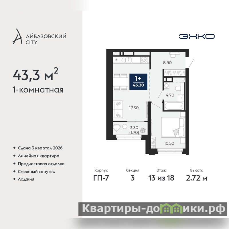 Однокомнатная квартира с предчистовой отделкой в ЖК "Айвазовский City" на 13 этаже. Общая площадь: 43.3 кв.м., жилая: 10.5 кв.м., площадь просторной кухни-столовой: 17.5 кв.м. Все окна выходят на одну сторону. В квартире одна лоджия, один совмещенный санузел. Высота потолков 2.72 м.
