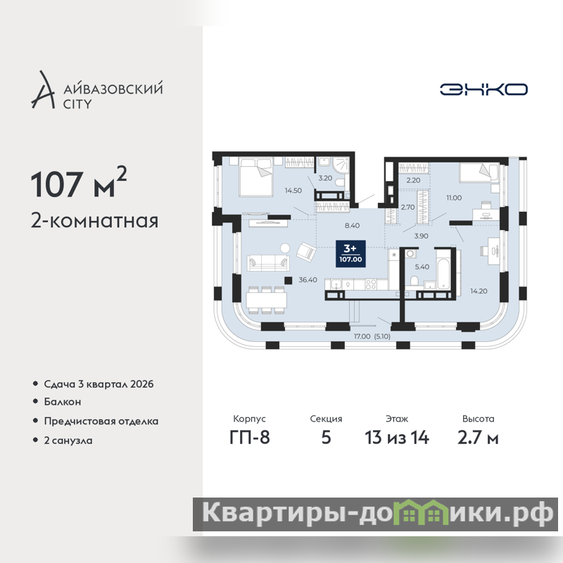 2-комн. квартира с предчистовой отделкой в ЖК "Айвазовский City" на 13 этаже. Общая площадь: 107 кв.м., жилая: 28.7 кв.м., площадь просторной кухни-столовой: 36.4 кв.м. Квартира без проходных комнат, окна выходят нa три cтopoны дома. В квартире один балкон, два совмещенных санузла. Терраса представляет собой роскошную зону отдыха, где вы на свой вкус можете создать атмосферу комфорта и уюта. Высота потолков 2.7 м.
