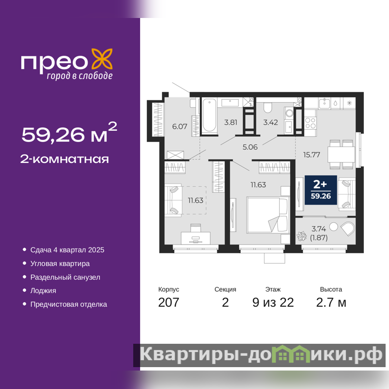 2-комн. квартира с предчистовой отделкой в ЖК "Прео" на 9 этаже. Общая площадь: 59.26 кв.м., жилая: 23.26 кв.м., площадь просторной кухни-столовой: 15.77 кв.м. Угловая квартира, идеально подойдет любителям тишины и панорамных видов. В квартире одна лоджия, один раздельный санузел. Высота потолков 2.7 м.