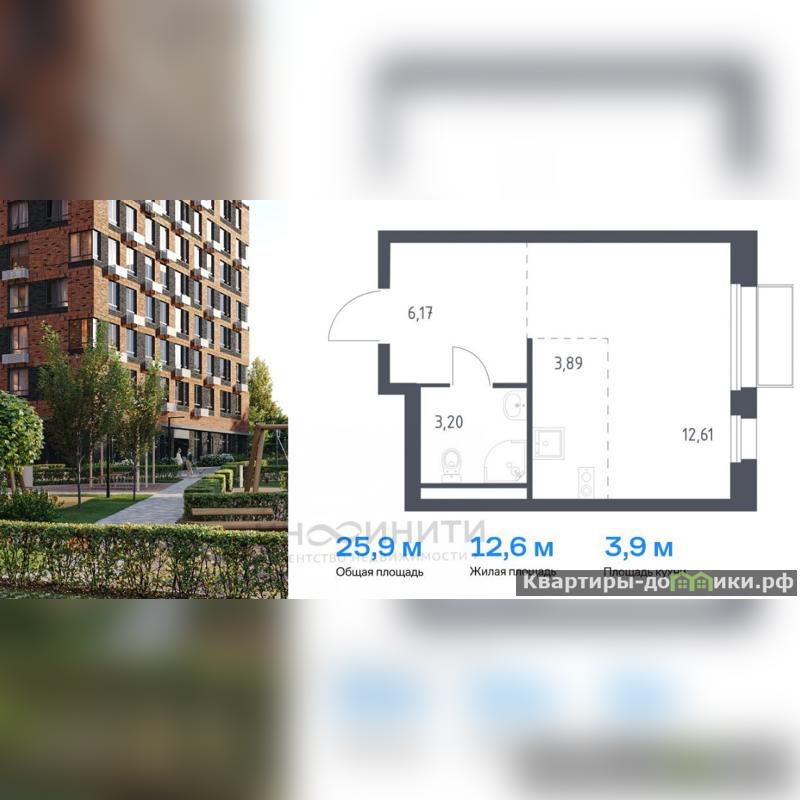 Студия расположена в монолитном доме, общая площадь квартиры 25,87 м2, жилая 12,61 м2, кухня-ниша 4,5 м2, СУ совмещенный 3,9 м2. Квартира продается с чистовой отделкой.
