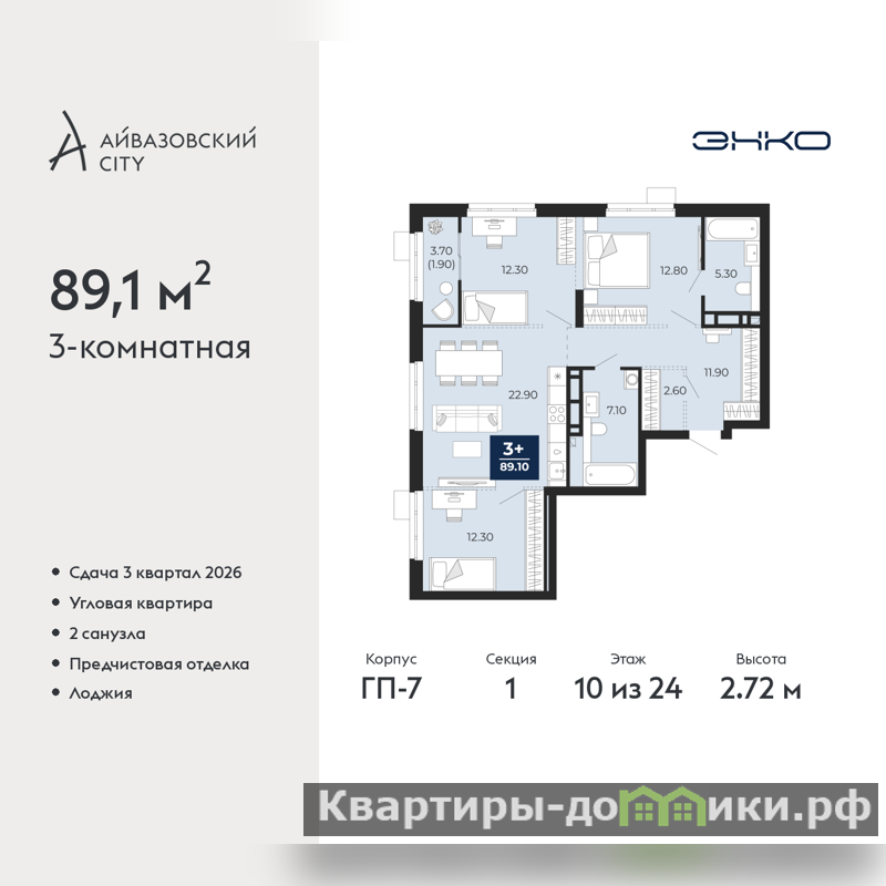 Трехкомнатная квартира от застройщика с предчистовой отделкой в ЖК "Айвазовский City" на 10 этаже. Общая площадь: 89.1 кв.м., жилая: 37.4 кв.м., площадь просторной кухни-столовой: 22.9 кв.м. Угловая квартира, идеально подойдет любителям тишины и панорамных видов. В квартире одна лоджия, два совмещенных санузла. Высота потолков 2.72 м.