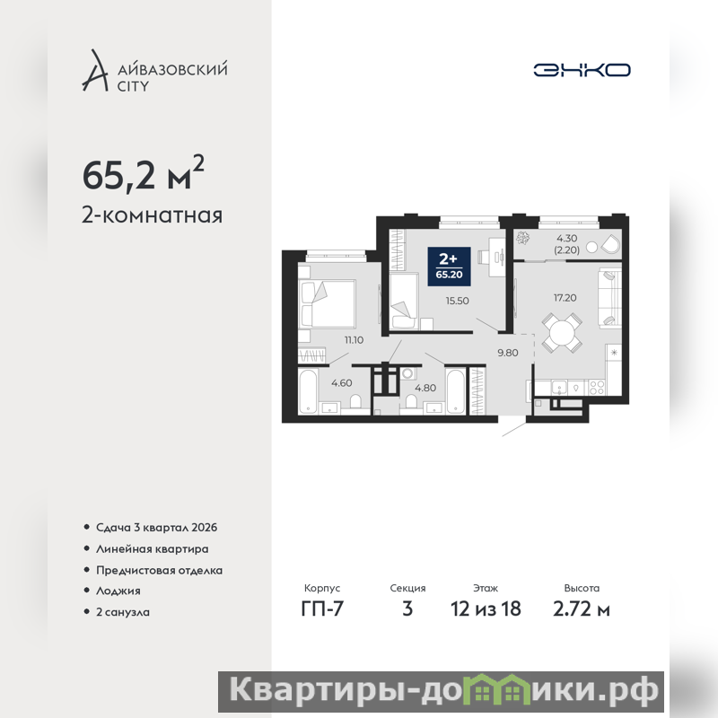 Двухкомнатная квартира от застройщика с предчистовой отделкой в ЖК "Айвазовский City" на 12 этаже. Общая площадь: 65.2 кв.м., жилая: 26.6 кв.м., площадь просторной кухни-столовой: 17.2 кв.м. Комнаты изолированные, все окна выходят на одну сторону. В квартире одна лоджия, два совмещенных санузла. Высота потолков 2.72 м.