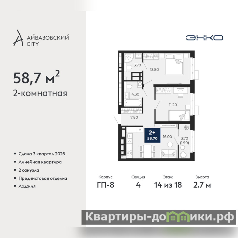Двухкомнатная квартира от застройщика с предчистовой отделкой в ЖК "Айвазовский City" на 14 этаже. Общая площадь: 58.7 кв.м., жилая: 25 кв.м., площадь просторной кухни-столовой: 16 кв.м. Комнаты изолированные, все окна выходят на одну сторону. В квартире одна лоджия, два совмещенных санузла. Высота потолков 2.7 м.