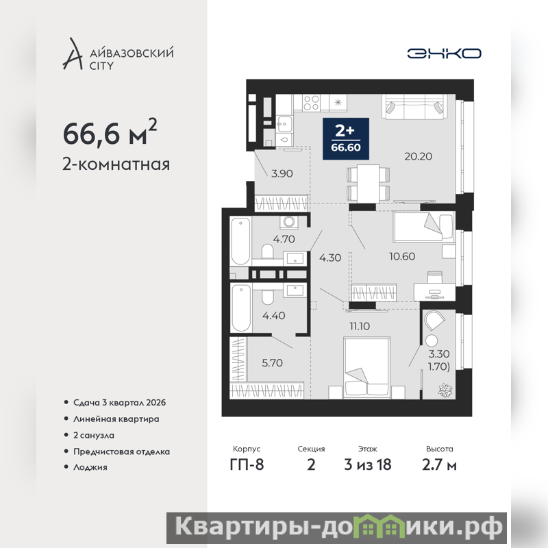 Продается 2-комн. квартира с предчистовой отделкой в ЖК "Айвазовский City" на 3 этаже. Общая площадь: 66.6 кв.м., жилая: 21.7 кв.м., площадь просторной кухни-столовой: 20.2 кв.м. Комнаты изолированные, все окна выходят на одну сторону. В квартире одна лоджия, два совмещенных санузла. Высота потолков 2.7 м.
