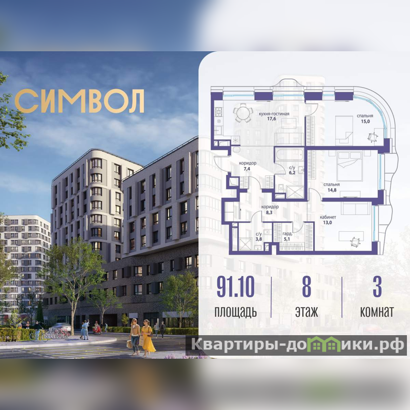 Продается 3-комнатная квартира от застройщика: общая площадь 91.10 м, жилая 42.80 м, кухня 17.60 м, 8-й этаж, жилой квартал Вдохновение, корпус 34 (секция 1) . Срок сдачи: 4 квартал 2027 года.