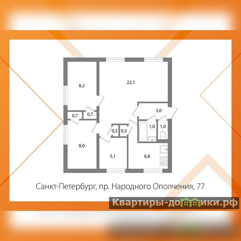 Эргономичная планировка: кухня - 6,8 кв.м, комнаты - 22,2 кв.м+8,2 кв.м+8,00 кв.м.+ 5,1 кв.м.