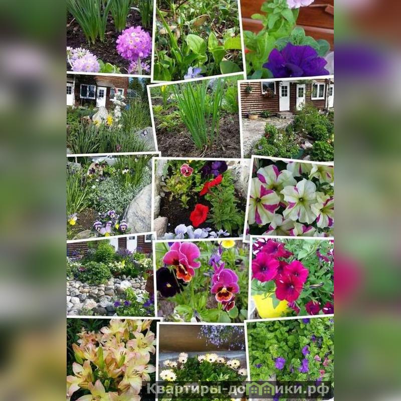 На участке растут яблоня, ели, горная сосна, кедр, лиственница, пионы, нарциссы, тюльпаны, лилии, календула, анютины глазки, кусты смородины и малины, а также овощные грядки.