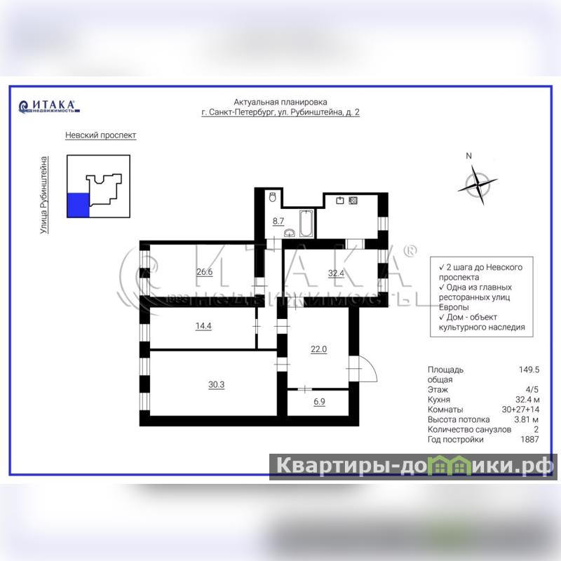 1-89669 Если вы хотите жить в интересном месте, где сочетается деловая культурная жизнь Северной столицы, где в шаговой доступности музеи, театры и лучшие рестораны города - это квартира для Вас! Парадный вход с мраморной лестницей, хороший лифт (Отис). Окна квартиры на обе стороны: на улицу Рубинштейна и во двор. Сделан добротный ремонт, 2 санузла, высота потолка 3,81, комнаты все изолированные, кухня-столовая 31 кв.м и большой холл. Просмотры в любое время по договоренности.