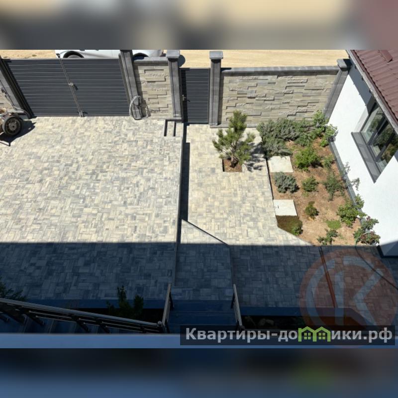 - участок огорожен забором, откатные ворота, двор выложен плиткой, есть зеленые зоны, место для барбекю, бассейна и парковки нескольких автомобилей.