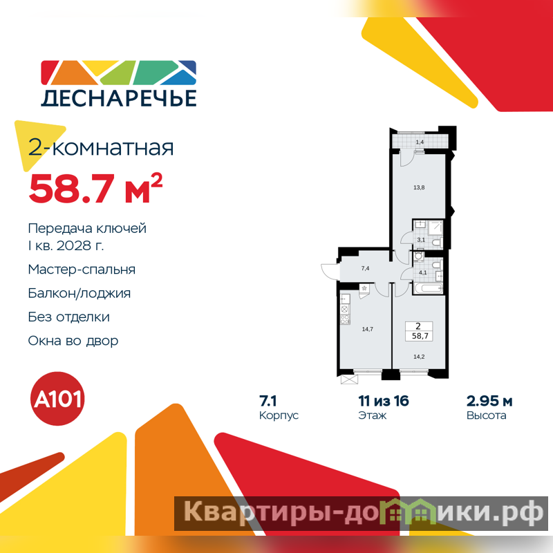 Дом монолитный, многоподъездный, переменной этажности, от 8 до 16 этажей. Квартира находится в 1-й секции высотой 14 этажей в корпусе 7.1. На этаже 5 квартир. В подъезде 1 пассажирский и 1 грузовой лифт. Начало строительства - 2 квартал 2025 года. Окончание строительства - 1 квартал 2028 года. Оформление сделки по договору долевого участия.