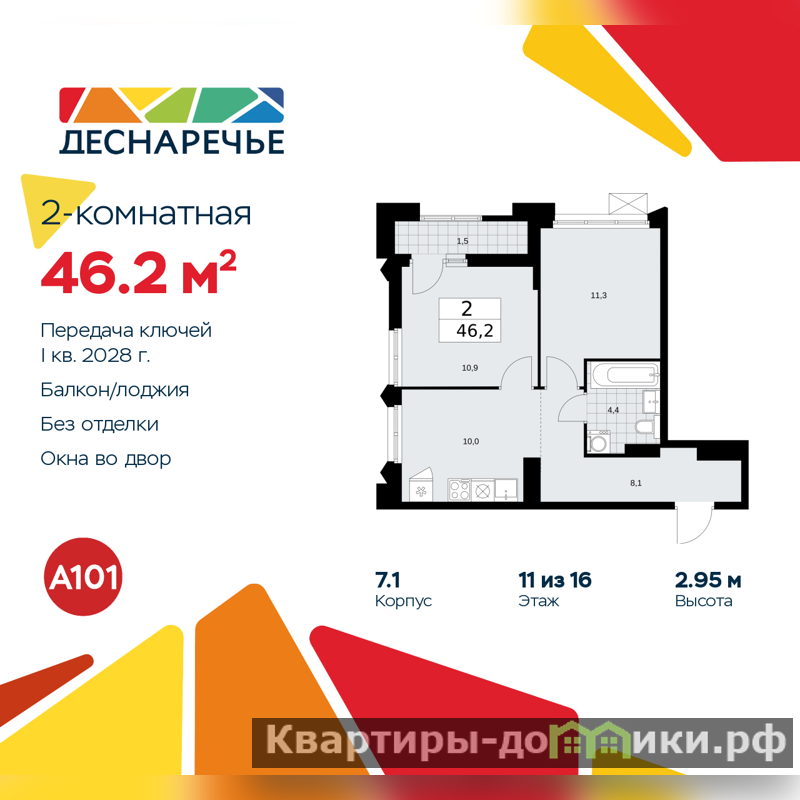 Продается 2-комн. квартира в ЖК "Деснаречье" на 11 этаже. Квартира без отделки, полностью готова к ремонту. Общая площадь: 46.2 кв.м., жилая: 22.2 кв.м., площадь просторной кухни-столовой: 10 кв.м. Квартира угловая, окна oбecпeчивaют paвнoмepнoe ocвeщeниe в тeчeниe дня. В квартире одна лоджия, один совмещенный санузел. Высота потолков 2.95 м.