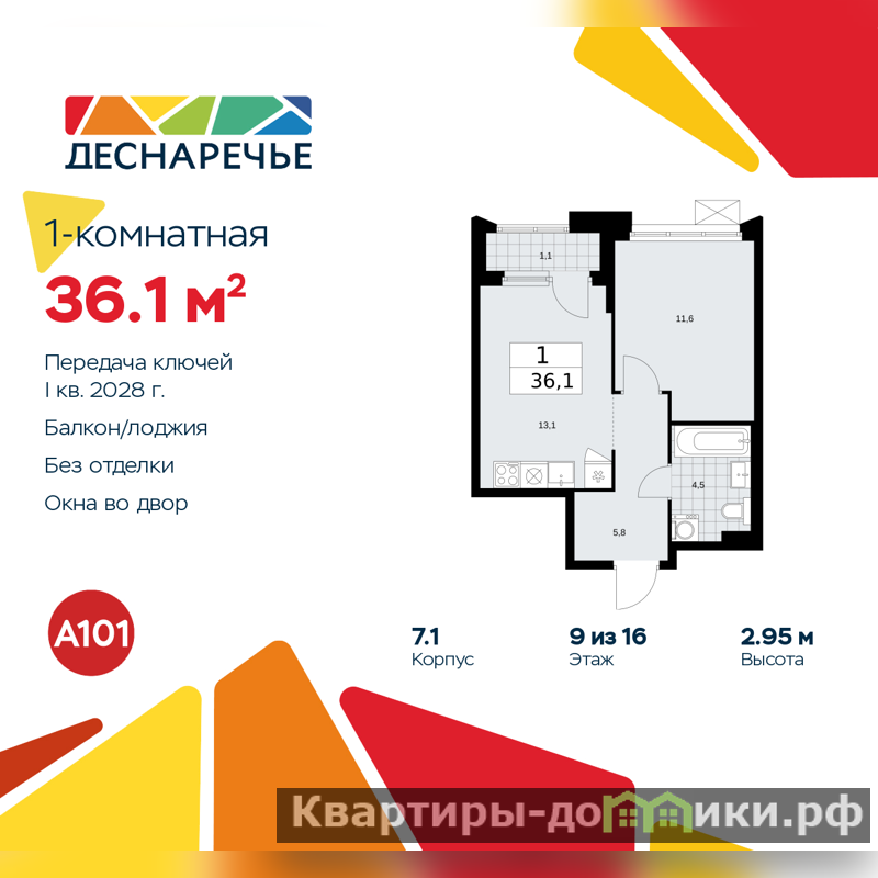 Продается 1-комн. квартира в ЖК "Деснаречье" на 9 этаже. Квартира без отделки, новый собственник может сделать ремонт по своему дизайн-проекту. Общая площадь: 36.1 кв.м., жилая: 11.6 кв.м., площадь просторной кухни-столовой: 13.1 кв.м. Все окна выходят на одну сторону. В квартире одна лоджия, один совмещенный санузел. Высота потолков 2.95 м.