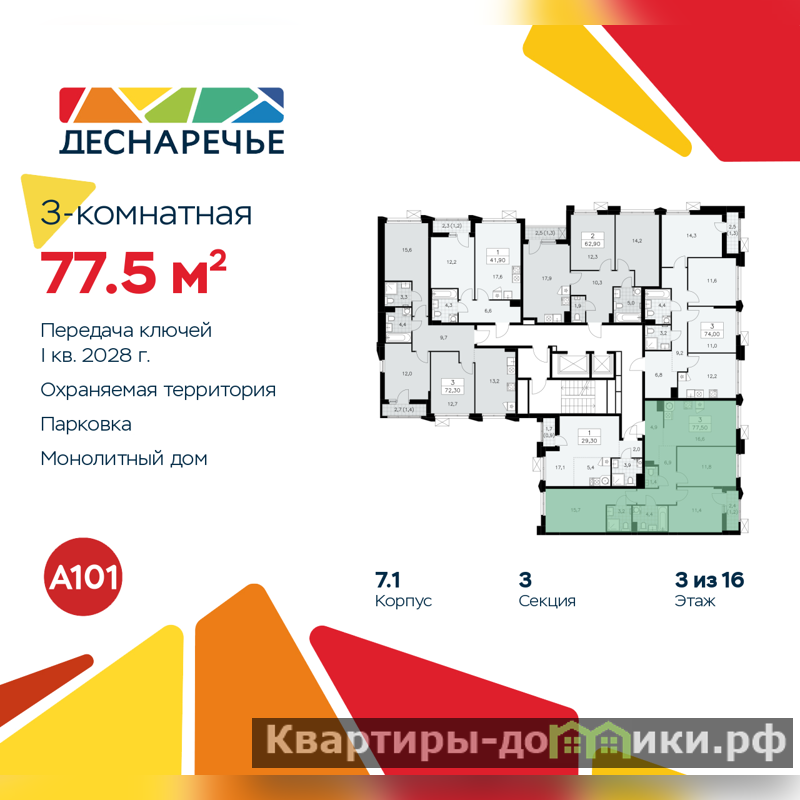 Просторная трехкомнатная квартира в ЖК "Деснаречье" на 3 этаже. Квартира без отделки, после оформления собственности можно делать ремонт. Общая площадь: 77.5 кв.м., жилая: 38.9 кв.м., площадь просторной кухни-столовой: 16.6 кв.м. Квартира - распашонка, без проходных комнат, окна выходят на paзные стороны дома. В квартире одна лоджия, два совмещенных санузла. Высота потолков 2.95 м.
