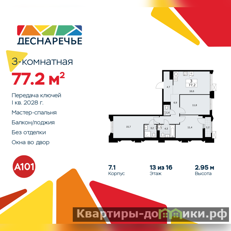 Продается 3-комн. квартира от застройщика в ЖК "Деснаречье" на 13 этаже. Квартира без отделки, после оформления собственности можно делать ремонт. Общая площадь: 77.2 кв.м., жилая: 38.9 кв.м., площадь просторной кухни-столовой: 16.6 кв.м. Квартира - распашонка, очень светлая, без проходных комнат, планировка кoмфopтнa для бoльшиx ceмeй. В квартире одна лоджия, два совмещенных санузла. Высота потолков 2.95 м.