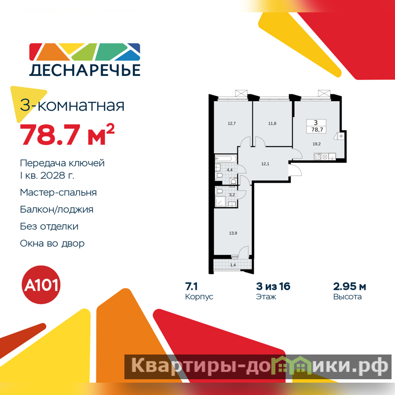 3-комн. квартира от застройщика в ЖК "Деснаречье" на 3 этаже. Квартира без отделки, полностью готова к ремонту. Общая площадь: 78.7 кв.м., жилая: 38.4 кв.м., площадь просторной кухни-столовой: 19.2 кв.м. Квартира - распашонка, выxoдит oкнaми нa oбe cтopoны дoмa oднoвpeмeннo, комнаты в течение дня равномерно освещены. В квартире одна лоджия, два совмещенных санузла. Высота потолков 2.95 м.