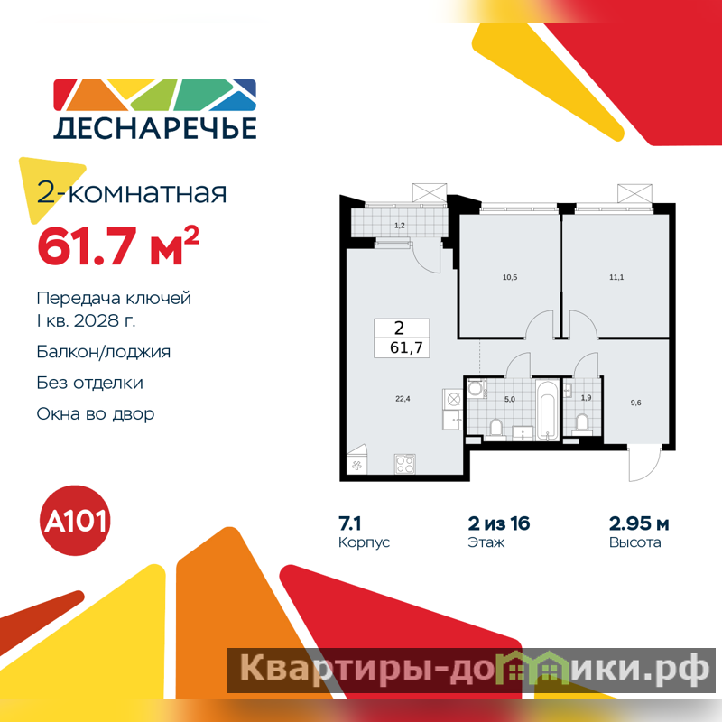 2-комн. квартира в ЖК "Деснаречье" на 2 этаже. Квартира без отделки, после получения ключей можно делать ремонт. Общая площадь: 61.7 кв.м., жилая: 21.6 кв.м., площадь просторной кухни-столовой: 22.4 кв.м. Комнаты изолированные, все окна выходят на одну сторону. В квартире одна лоджия, один совмещенный и один раздельный санузел. Высота потолков 2.95 м.