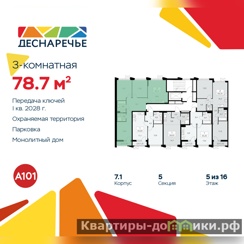 Дом монолитный, многоподъездный, переменной этажности, от 8 до 16 этажей. Квартира находится в 5-й секции высотой 8 этажей в корпусе 7.1. На этаже 5 квартир. В подъезде 1 грузовой лифт. Начало строительства - 2 квартал 2025 года. Окончание строительства - 1 квартал 2028 года. Оформление сделки по договору долевого участия.