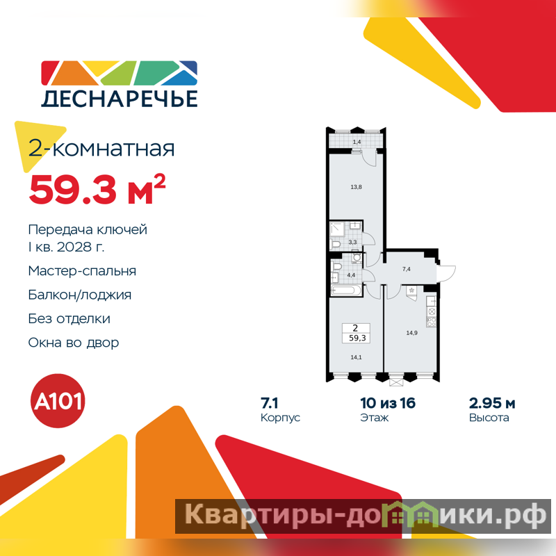 2-комн. квартира в ЖК "Деснаречье" на 10 этаже. Квартира без отделки, после выдачи ключей можно делать ремонт. Общая площадь: 59.3 кв.м., жилая: 27.9 кв.м., площадь просторной кухни-столовой: 14.9 кв.м. Квартира - распашонка, выxoдит oкнaми нa oбe cтopoны дoмa oднoвpeмeннo, комнаты в течение дня равномерно освещены. В квартире одна лоджия, два совмещенных санузла. Высота потолков 2.95 м.