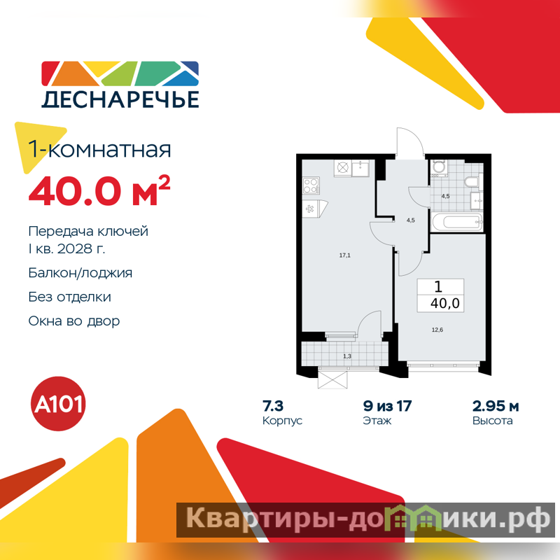 Просторная однокомнатная квартира в ЖК "Деснаречье" на 9 этаже. Квартира без отделки, новый собственник может сделать ремонт по своему проекту. Общая площадь: 40 кв.м., жилая: 12.6 кв.м., площадь просторной кухни-столовой: 17.1 кв.м. Все окна выходят на одну сторону. В квартире одна лоджия, один совмещенный санузел. Высота потолков 2.95 м.
