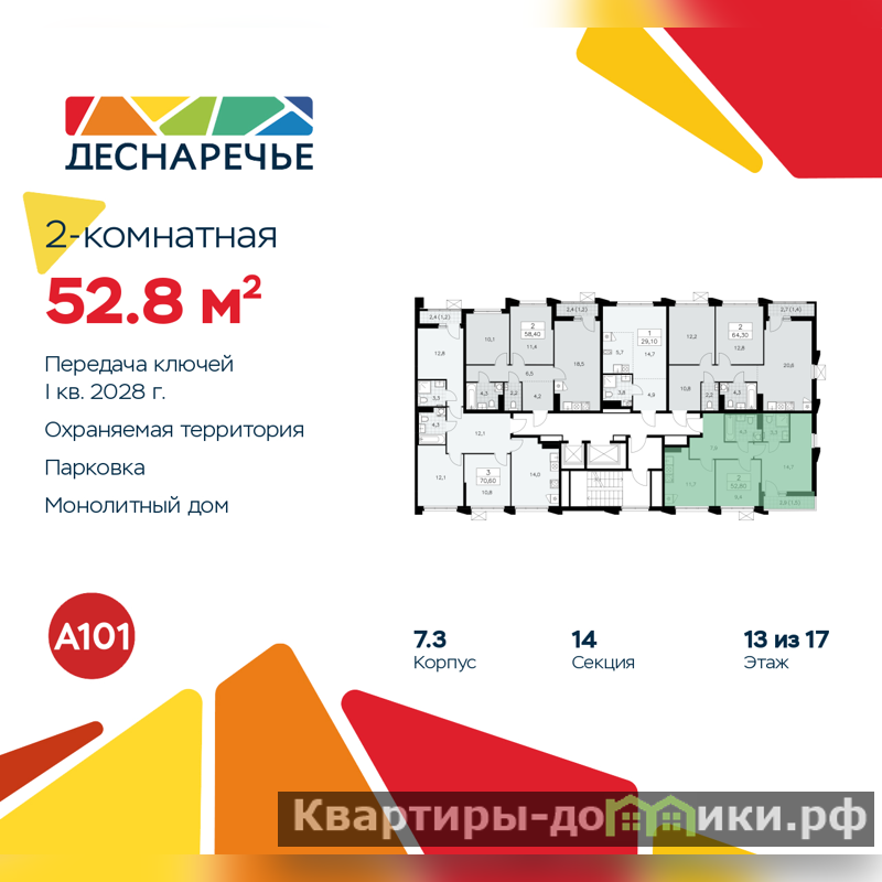 2-комн. квартира от застройщика в ЖК "Деснаречье" на 13 этаже. Квартира без отделки, после выдачи ключей можно делать ремонт. Общая площадь: 52.8 кв.м., жилая: 24.1 кв.м., площадь просторной кухни-столовой: 11.7 кв.м. Квартира угловая, очень светлая, естественная вентиляция при открытии окон. В квартире одна лоджия, два совмещенных санузла. Высота потолков 2.95 м.