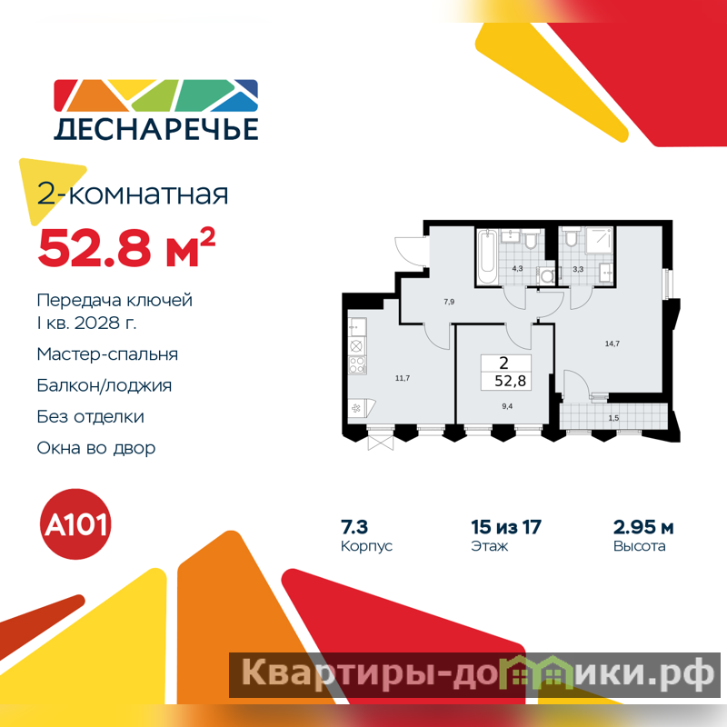2-комн. квартира в ЖК "Деснаречье" на 15 этаже. Квартира без отделки, полностью готова к чистовой отделке и дальнейшему ремонту. Общая площадь: 52.8 кв.м., жилая: 24.1 кв.м., площадь просторной кухни-столовой: 11.7 кв.м. Угловая квартира, идеально подойдет любителям тишины и панорамных видов. В квартире одна лоджия, два совмещенных санузла. Высота потолков 2.95 м.