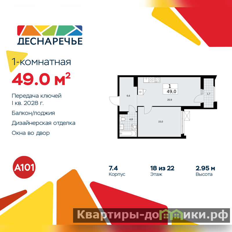 1-комн. квартира от застройщика с отделкой в ЖК "Деснаречье" на 18 этаже. Общая площадь: 49 кв.м., жилая: 15 кв.м., площадь просторной кухни-столовой: 20.9 кв.м. Все окна выходят на одну сторону. В квартире одна лоджия, один совмещенный санузел. Высота потолков 2.95 м.