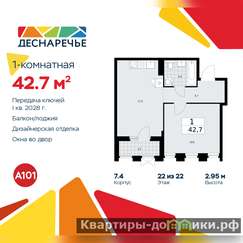 1-комн. квартира с отделкой в ЖК "Деснаречье" на 22 этаже. Общая площадь: 42.7 кв.м., жилая: 13.9 кв.м., площадь просторной кухни-столовой: 17.3 кв.м. Все окна выходят на одну сторону. В квартире одна лоджия, один совмещенный санузел. Высота потолков 2.95 м.