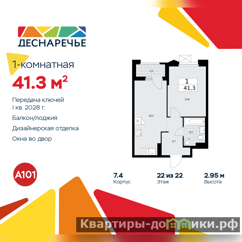 Продается 1-комн. квартира с отделкой в ЖК "Деснаречье" на 22 этаже. Общая площадь: 41.3 кв.м., жилая: 13.8 кв.м., площадь просторной кухни-столовой: 16.2 кв.м. Все окна выходят на одну сторону. В квартире одна лоджия, один совмещенный санузел. Высота потолков 2.95 м.