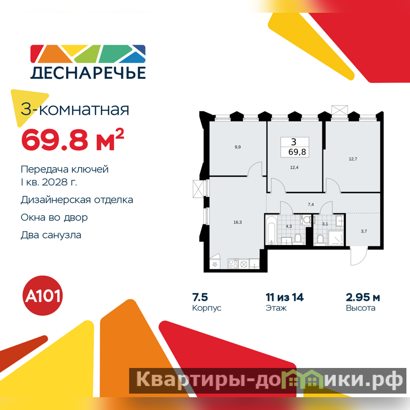Продается 3-комн. квартира от застройщика с отделкой в ЖК "Деснаречье" на 11 этаже. Общая площадь: 69.8 кв.м., жилая: 35 кв.м., площадь просторной кухни-столовой: 16.3 кв.м. Угловая квартира, очень светлая, естественная вентиляция при открытии окон. В квартире два совмещенных санузла. Высота потолков 2.95 м.