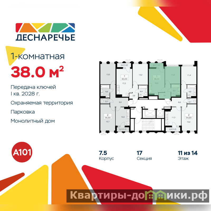 Дом монолитный, трехподъездный, переменной этажности, от 11 до 17 этажей. Квартира находится во 2-й секции высотой 17 этажей в корпусе 7.5. На этаже 4 квартиры. В подъезде 1 пассажирский и 1 грузовой лифт. Начало строительства - 2 квартал 2025 года. Окончание строительства - 1 квартал 2028 года. Оформление сделки по договору долевого участия.