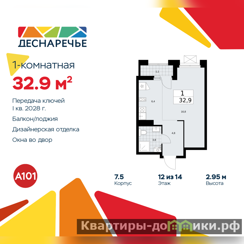 Продается 1-комн. квартира-студия с отделкой в ЖК "Деснаречье" на 12 этаже. Общая площадь: 32.9 кв.м., площадь гостиной 23.2 кв.м., из которых 6.4 кв.м. выделено под кухонную зону. Все окна выходят на одну сторону. В квартире одна лоджия, один совмещенный санузел. Высота потолков 2.95 м.