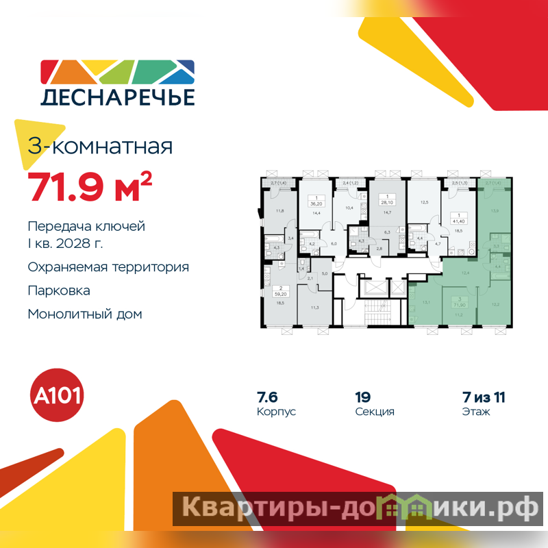 Дом монолитный, двухподъездный, высотой 11 этажей. Квартира находится в 1-й секции в корпусе 7.6. На этаже 5 квартир. В подъезде 1 пассажирский и 1 грузовой лифт. Начало строительства - 2 квартал 2025 года. Окончание строительства - 1 квартал 2028 года. Оформление сделки по договору долевого участия.