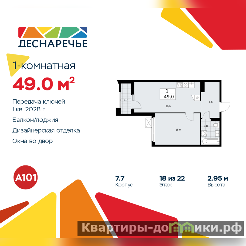 1-комн. квартира с отделкой в ЖК "Деснаречье" на 18 этаже. Общая площадь: 49 кв.м., жилая: 15 кв.м., площадь просторной кухни-столовой: 20.9 кв.м. Все окна выходят на одну сторону. В квартире одна лоджия, один совмещенный санузел. Высота потолков 2.95 м.