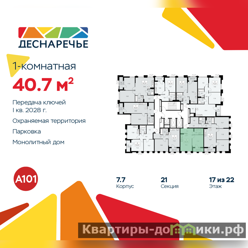 Квартира находится в корпусе 7.7. Дом монолитный, одноподъездный, высотой 22 этажа. На этаже 9 квартир. В подъезде 1 пассажирский и 2 грузовых лифта. Начало строительства - 2 квартал 2025 года. Окончание строительства - 1 квартал 2028 года. Оформление сделки по договору долевого участия.
