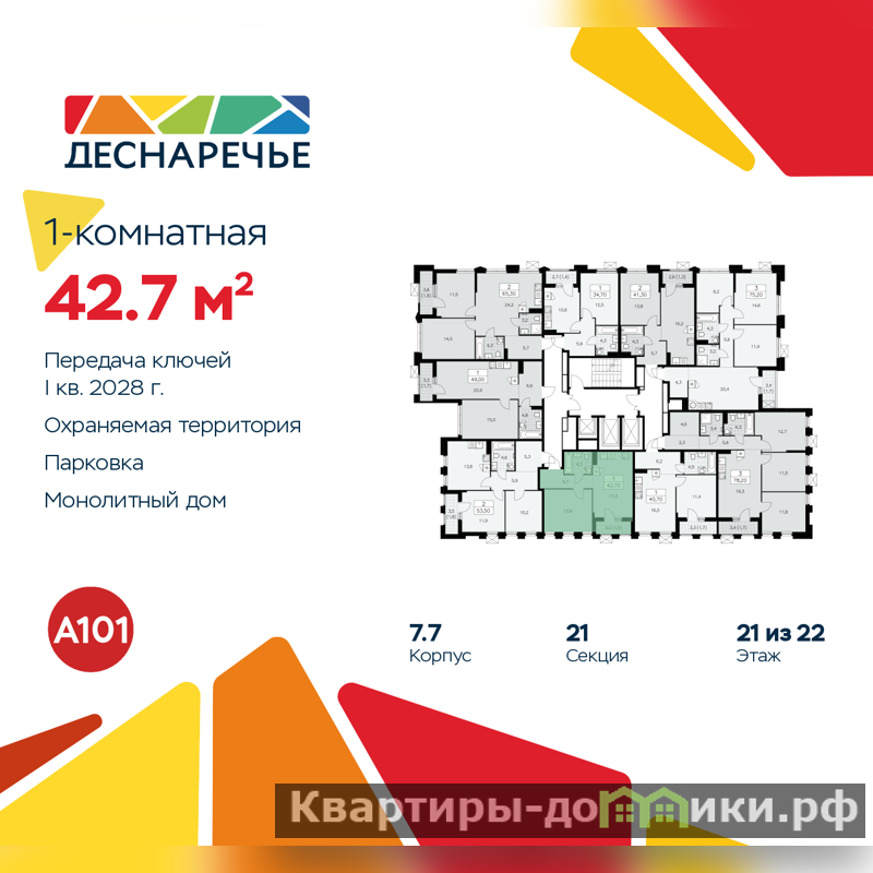 Квартира находится в корпусе 7.7. Дом монолитный, одноподъездный, высотой 22 этажа. На этаже 9 квартир. В подъезде 1 пассажирский и 2 грузовых лифта. Начало строительства - 2 квартал 2025 года. Окончание строительства - 1 квартал 2028 года. Оформление сделки по договору долевого участия.