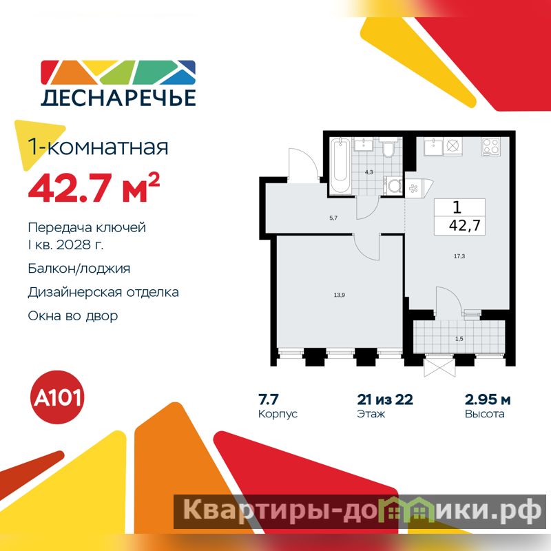 Просторная 1-комн. квартира с отделкой в ЖК "Деснаречье" на 21 этаже. Общая площадь: 42.7 кв.м., жилая: 13.9 кв.м., площадь просторной кухни-столовой: 17.3 кв.м. Все окна выходят на одну сторону. В квартире одна лоджия, один совмещенный санузел. Высота потолков 2.95 м.