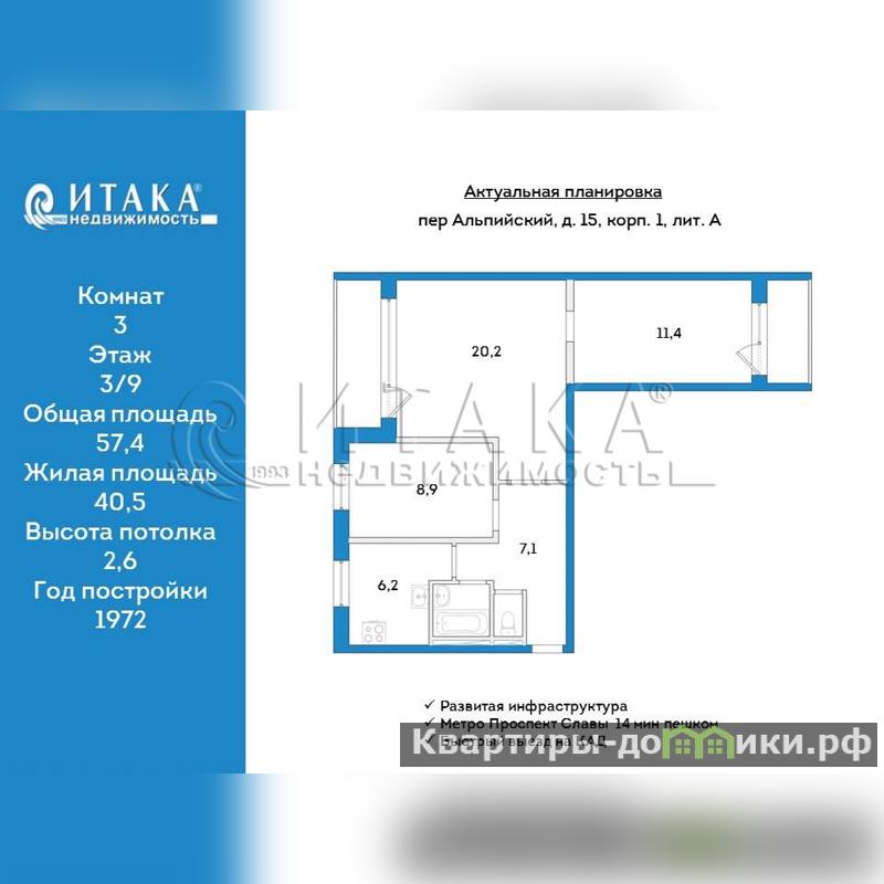 1-91579 В прямой продаже 3-х комнатная квартира в глубине тихого зеленого квартала. 14 минут пешком от метро Проспект Славы. 3/9 этаж. Квартира двусторонняя, площадь 57,4 м.кв. плюс два балкона: 3,7 и 2,4 м.кв. Комнаты смежно-изолированные: 20,2+11,4 и 8,9 м.кв. Потолки 2,6 м. Большая прихожая, санузел раздельный, в кафеле, чугунная ванна. Кухня 6,2 м.кв., газовая плита. На полу ламинат и линолеум, двойная металлическая входная дверь, в комнатах заменены радиаторы отопления. Маленькая комната после ремонта. Двор и переулок утопают в зелени, у дома хоккейно-баскетбольная и детская площадки, комплекс турников. Отлично развит район, все рядом. У дома 2 школы, гимназия, 4 детских сада, продуктовые магазины, МФЦ, парк отдыха Купчинский сквер, в котором завершаются работы по современному благоустройству и ландшафтному оформлению. 12 минут на электричке до центра города: Витебский вокзал, м. Пушкинская; 20 минут до Царского села и Павловска. До станции 8 минут пешком. Быстрый выезд на КАД – 10 минут. Один взрослый собственник, прямая продажа. Можно приобрести в ипотеку