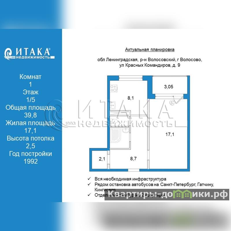 ? общая площадь – 39.8 м2, комната - 17.1, прихожая - 8.7, кухня - 8.1м2, лоджия - 3.05 м2 на 1/5 этаже панельного дома 1992 года постройки, 121 Гатчинской улучшенной серии